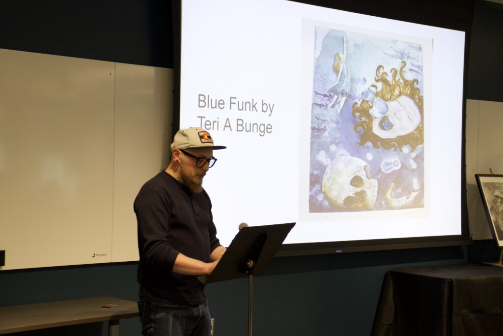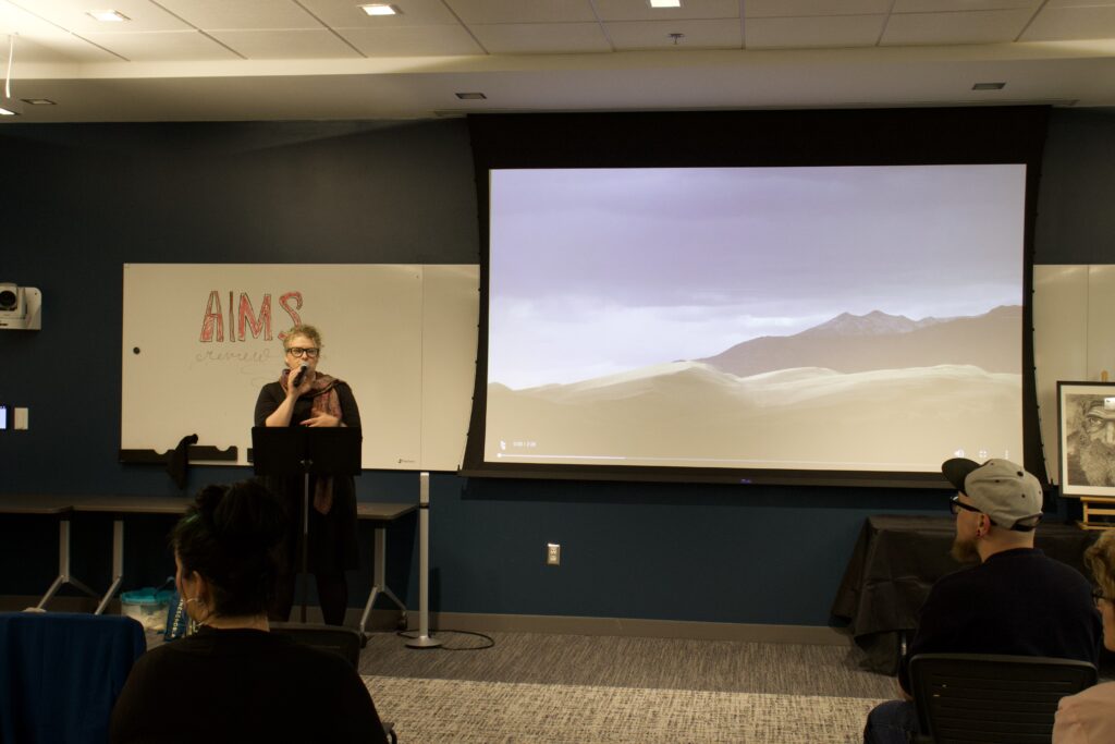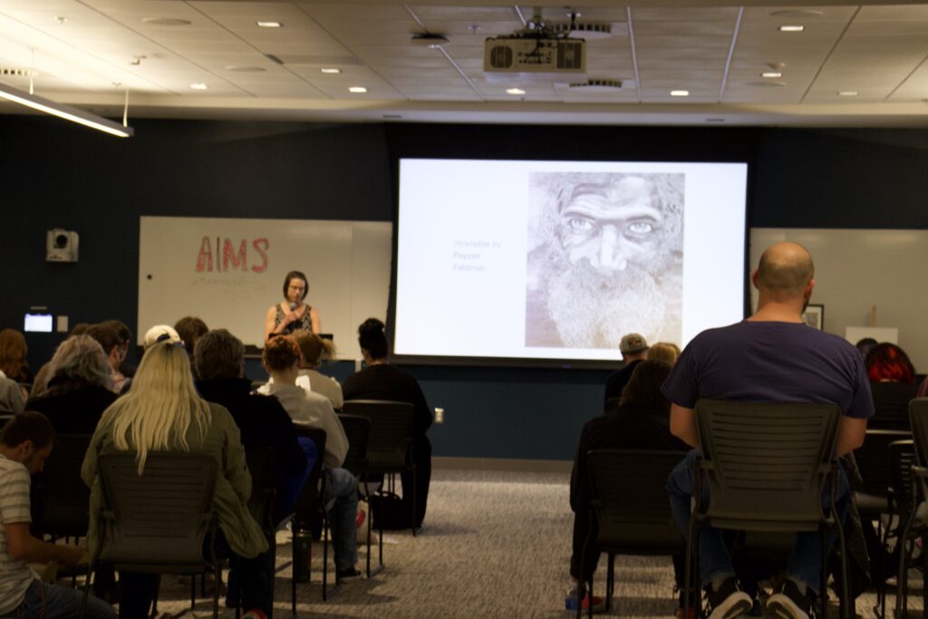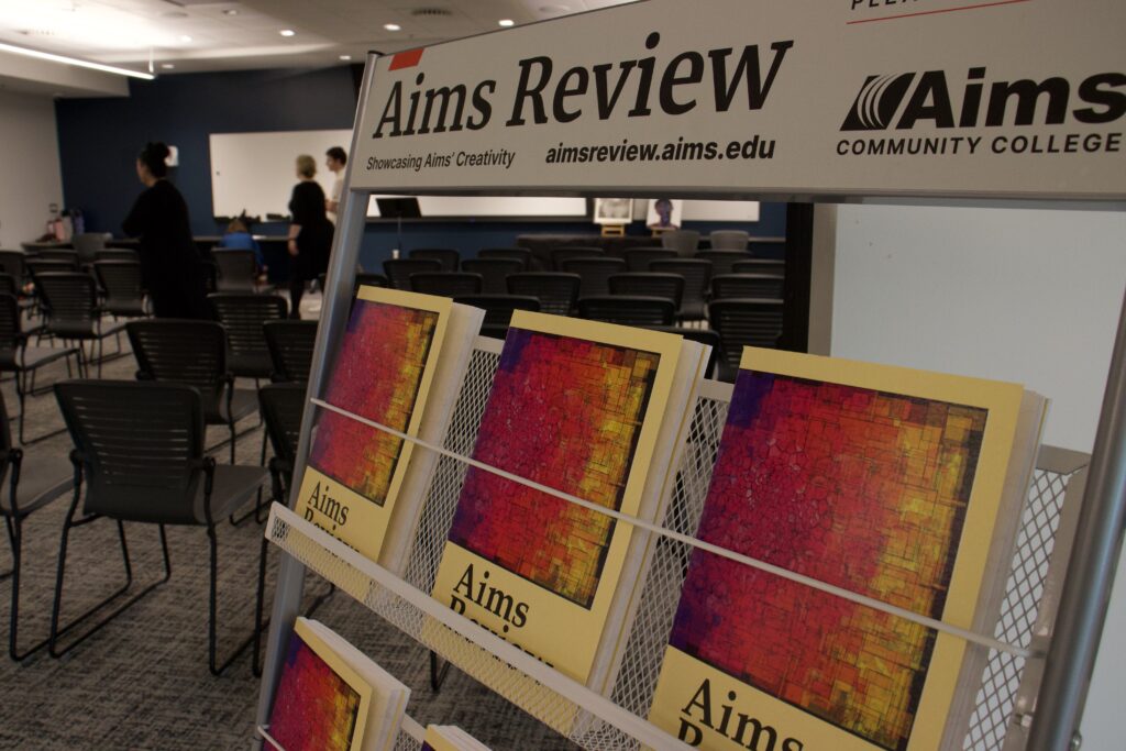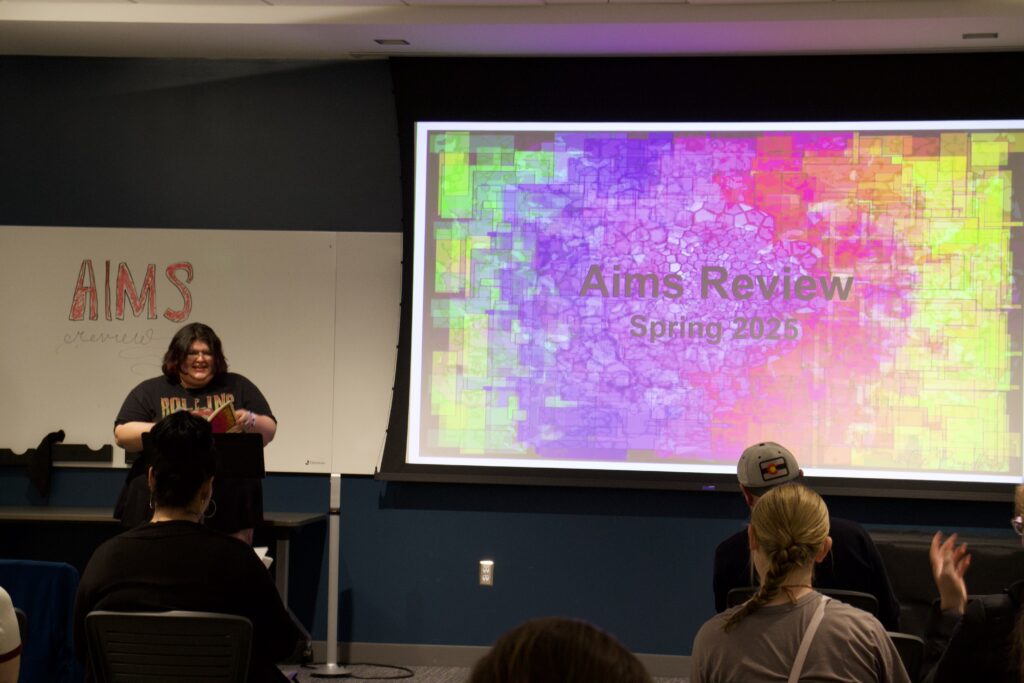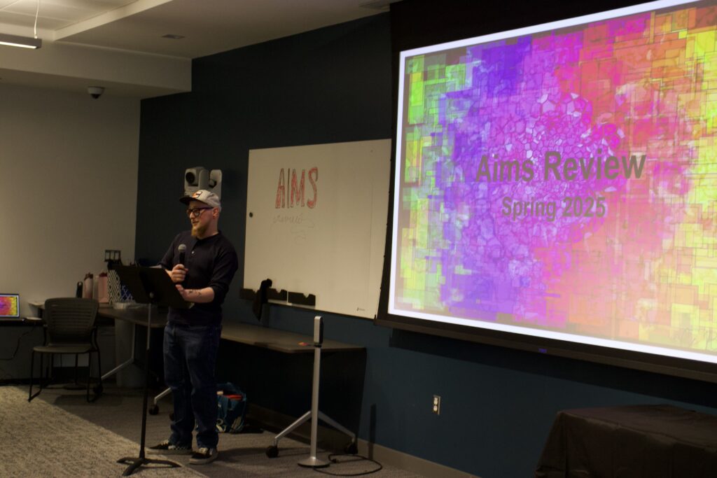 On May 1, 2025, Aims Review launched the 17th volume containing art made by students, faculty, and alumni in a print volume and on the Aims Review Website. During the launch artists presented their work through a multimedia video of Phillip Lara’s poem “11.10.24;” fiction readings of “Beyond the Rainwall” by Sundance Hollingsworth and “Coloratus Malum” by Eli Lundgreen; non-fiction readings of “Toe Tag” by Mariah Crawford, “Adventure” by Josephine Yockim, “Erosion: An Exploration of Loss, Grief, and Hope in Chronic Illness” by Melissa J. Troutman; poetry readings of “Burt Marshmallow” by Matthew Frink, “Life as Art” by Mikki Arrivas, “Light through the Cracks” by Chelsea Cramer, “Worn Yarn” by Brooke Capuano, “Uprooted” by Lee Clouston, “Haunted House Upkeep, or EAP’s Quite Night In” by AT Banks, “There Will Always Be Monsters” by Josephine Yockim, and “My Vanity” by Eli Lundgreen. Several visual artists also brought their work in to be displayed throughout the event: Indivisible by Pepper Feldman, Sailing Off Into the Sunset and An Ocean Away by Gracie Marquez, Moonrays by Istana Castillo, Harvesting Dreams at Dusk by Megan Blaser, With a Side of Syrup by Taylor Rehurek, Into the Storm by Mikki Arrivas, Year of the Dragon by Aidan Martin, Memento Mor: One Day Death Comes for Us All by Heather Jewell Charon, and The Great Wave of Death by Azul Gonzalez.