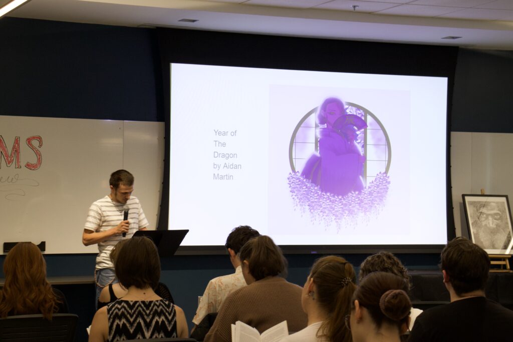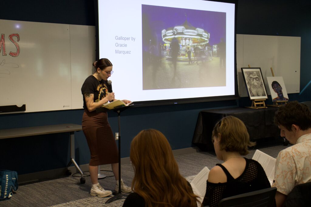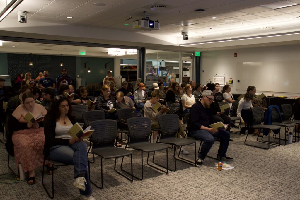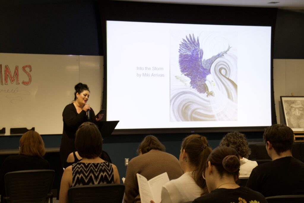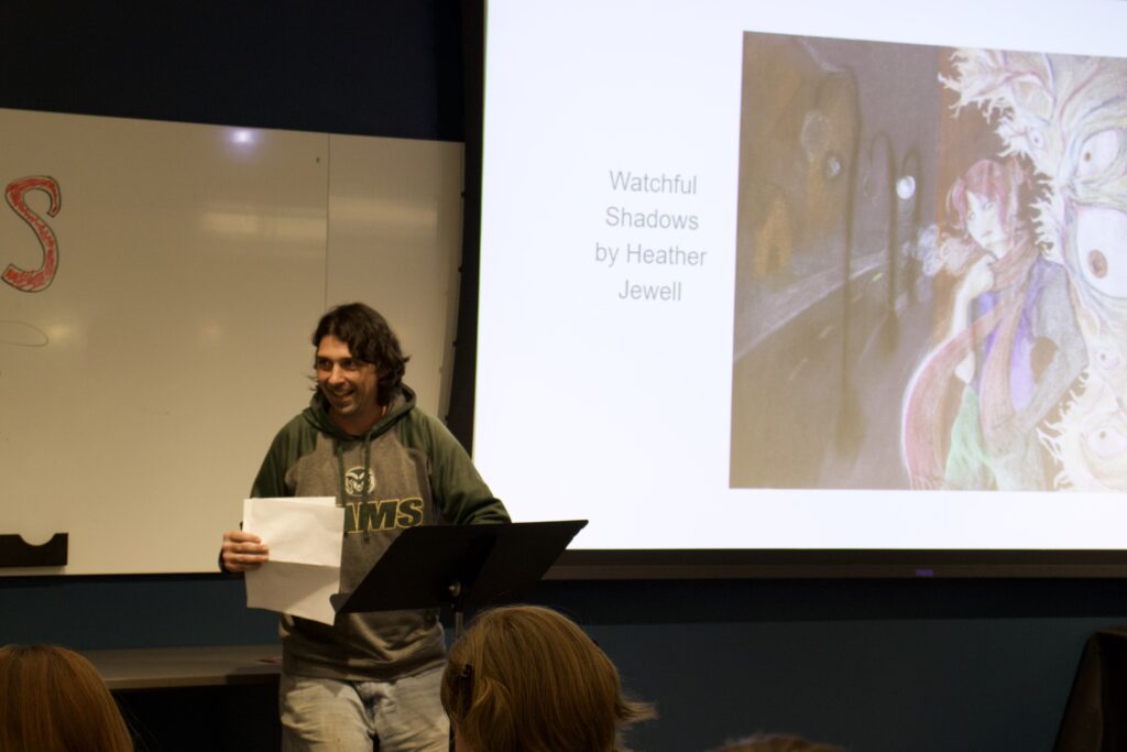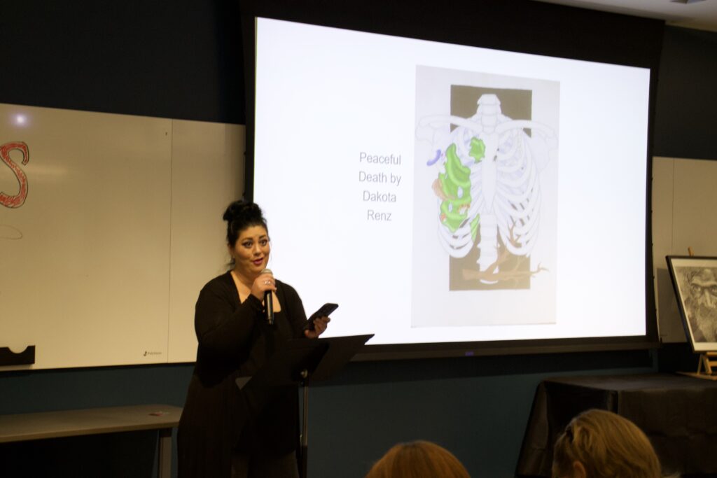 On May 1, 2025, Aims Review launched the 17th volume containing art made by students, faculty, and alumni in a print volume and on the Aims Review Website. During the launch artists presented their work through a multimedia video of Phillip Lara’s poem “11.10.24;” fiction readings of “Beyond the Rainwall” by Sundance Hollingsworth and “Coloratus Malum” by Eli Lundgreen; non-fiction readings of “Toe Tag” by Mariah Crawford, “Adventure” by Josephine Yockim, “Erosion: An Exploration of Loss, Grief, and Hope in Chronic Illness” by Melissa J. Troutman; poetry readings of “Burt Marshmallow” by Matthew Frink, “Life as Art” by Mikki Arrivas, “Light through the Cracks” by Chelsea Cramer, “Worn Yarn” by Brooke Capuano, “Uprooted” by Lee Clouston, “Haunted House Upkeep, or EAP’s Quite Night In” by AT Banks, “There Will Always Be Monsters” by Josephine Yockim, and “My Vanity” by Eli Lundgreen. Several visual artists also brought their work in to be displayed throughout the event: Indivisible by Pepper Feldman, Sailing Off Into the Sunset and An Ocean Away by Gracie Marquez, Moonrays by Istana Castillo, Harvesting Dreams at Dusk by Megan Blaser, With a Side of Syrup by Taylor Rehurek, Into the Storm by Mikki Arrivas, Year of the Dragon by Aidan Martin, Memento Mor: One Day Death Comes for Us All by Heather Jewell Charon, and The Great Wave of Death by Azul Gonzalez.