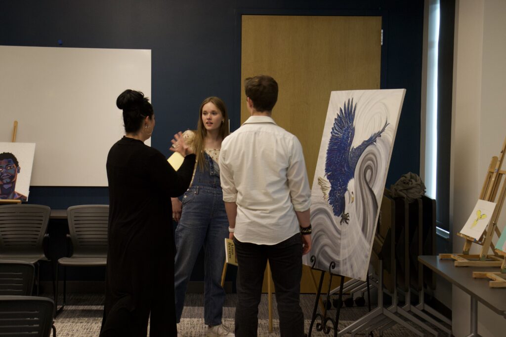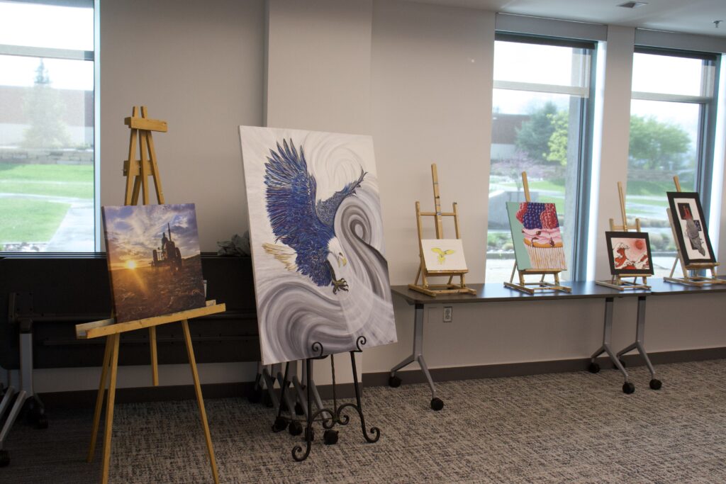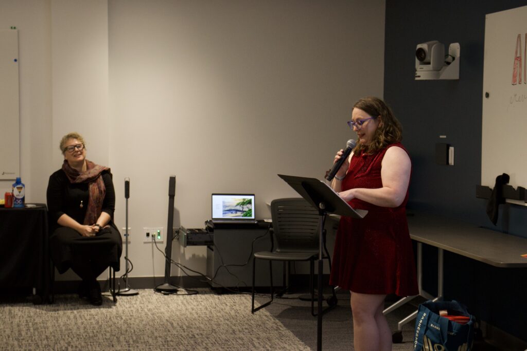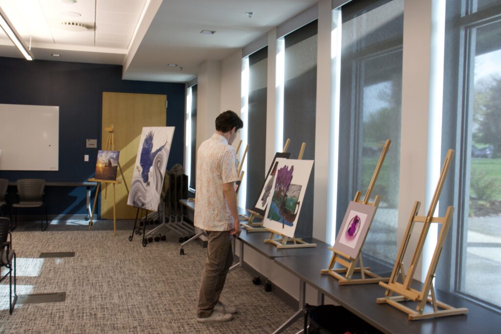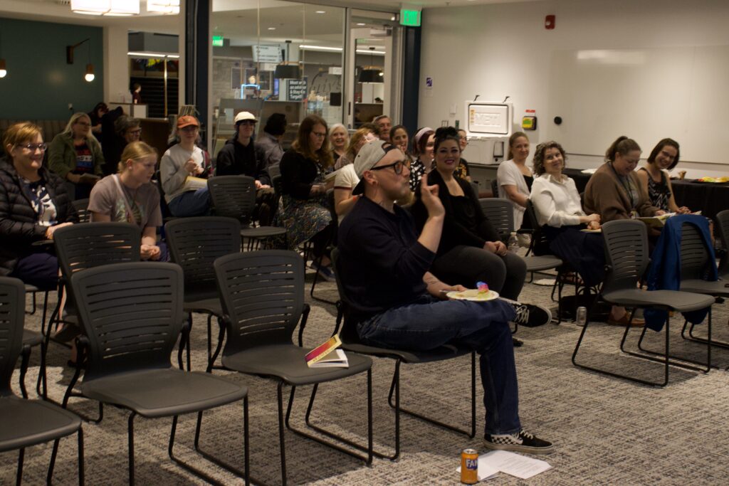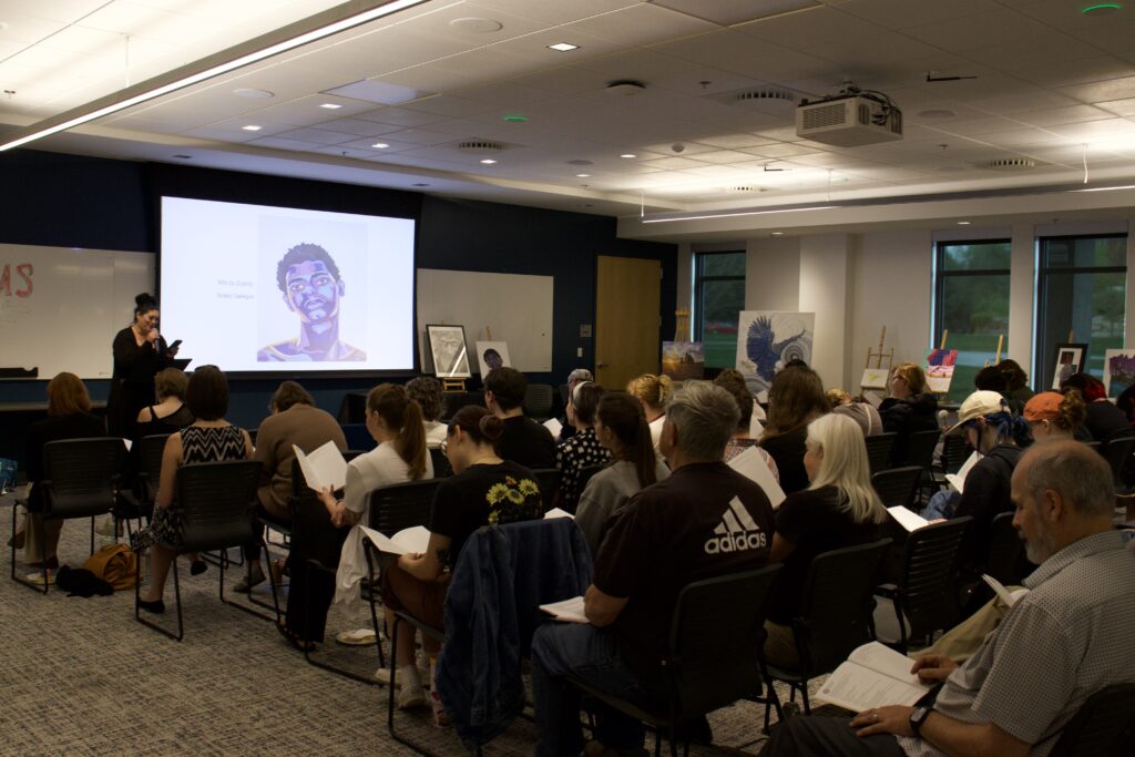 On May 1, 2025, Aims Review launched the 17th volume containing art made by students, faculty, and alumni in a print volume and on the Aims Review Website. During the launch artists presented their work through a multimedia video of Phillip Lara’s poem “11.10.24;” fiction readings of “Beyond the Rainwall” by Sundance Hollingsworth and “Coloratus Malum” by Eli Lundgreen; non-fiction readings of “Toe Tag” by Mariah Crawford, “Adventure” by Josephine Yockim, “Erosion: An Exploration of Loss, Grief, and Hope in Chronic Illness” by Melissa J. Troutman; poetry readings of “Burt Marshmallow” by Matthew Frink, “Life as Art” by Mikki Arrivas, “Light through the Cracks” by Chelsea Cramer, “Worn Yarn” by Brooke Capuano, “Uprooted” by Lee Clouston, “Haunted House Upkeep, or EAP’s Quite Night In” by AT Banks, “There Will Always Be Monsters” by Josephine Yockim, and “My Vanity” by Eli Lundgreen. Several visual artists also brought their work in to be displayed throughout the event: Indivisible by Pepper Feldman, Sailing Off Into the Sunset and An Ocean Away by Gracie Marquez, Moonrays by Istana Castillo, Harvesting Dreams at Dusk by Megan Blaser, With a Side of Syrup by Taylor Rehurek, Into the Storm by Mikki Arrivas, Year of the Dragon by Aidan Martin, Memento Mor: One Day Death Comes for Us All by Heather Jewell Charon, and The Great Wave of Death by Azul Gonzalez.